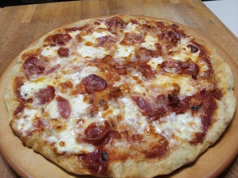 La pizza fatta in casa è una delle cose che più mi mandano in estasi culinaria in assoluto… Farla era un rito di famiglia, tanto che, come i peggiori bamboccioni, il ricordo idealizzato delle pizze fatte nell’infanzia mi ritorna, irrazionale, tutte le volte che riusciamo a fare una pizza adesso, dopo anni, facendomi concludere con l’iperbole «la pizza come si fa a casa mia non si fa in nessun posto!» — una cosa che gronda completo soggettivismo (non so a chi davvero, oltre alla mia famiglia, potrà piacere una miserrima pizza fatta col lievito istantaneo nel forno ventilato!), ma si attacca imperitura all’encefalo, accidenti… — per fortuna, la suggestione irrazionale è così tanta da poter essere trasferita in qualsiasi pizza che faccio io, nei peggiori forni catorci, cosa che fa incorrere in un nuovo iperbole sciocco «la pizza, come la faccio io, non la fa nessuno! perfino quella surgelata è meglio se la faccio io», nella più completa cecità della masturbazione culinario-narcisistica mentale! — questo articolo su come davvero va fatta mi aiuta molto a guarire!